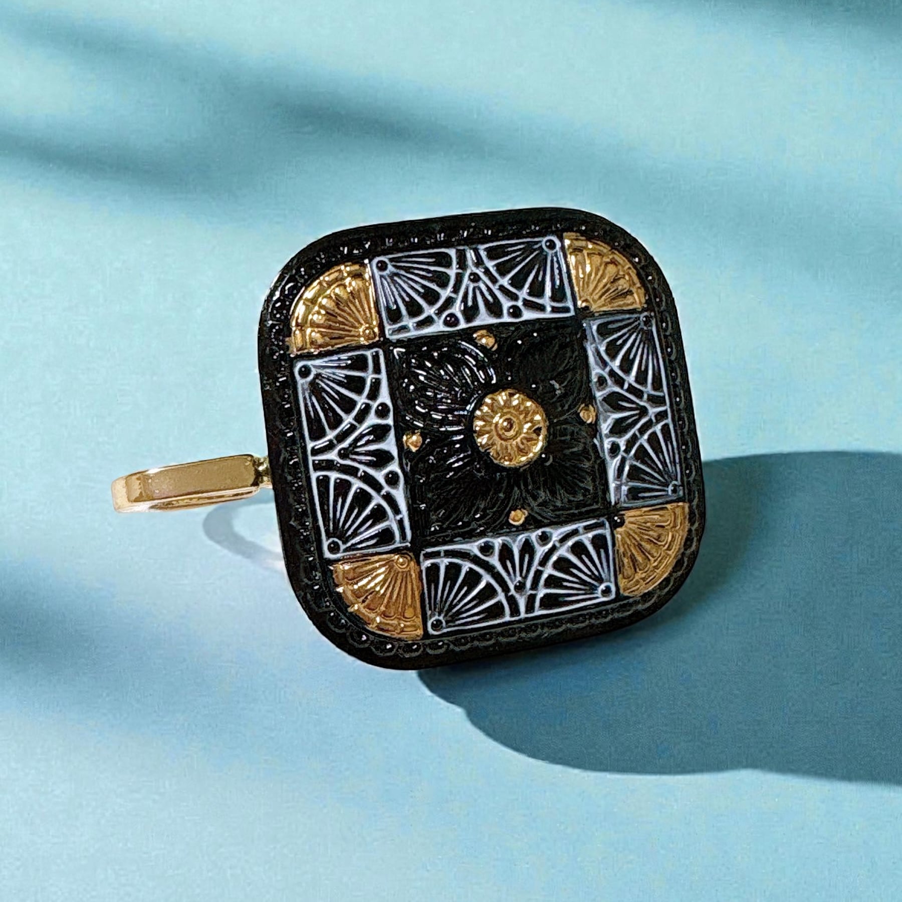夜が深まり、静けさの中でひそやかに光が浮かび上がるひととき。 深いブラックのチェコガラスに、彫刻模様を思わせる繊細な意匠とゴールドの装飾が重なり、凛とした存在感を放ちます。 甘さを抑えた配色は、装い全体を引き締めながらも重くなりすぎず、大人の気品と芯のある美しさを添えてくれます。