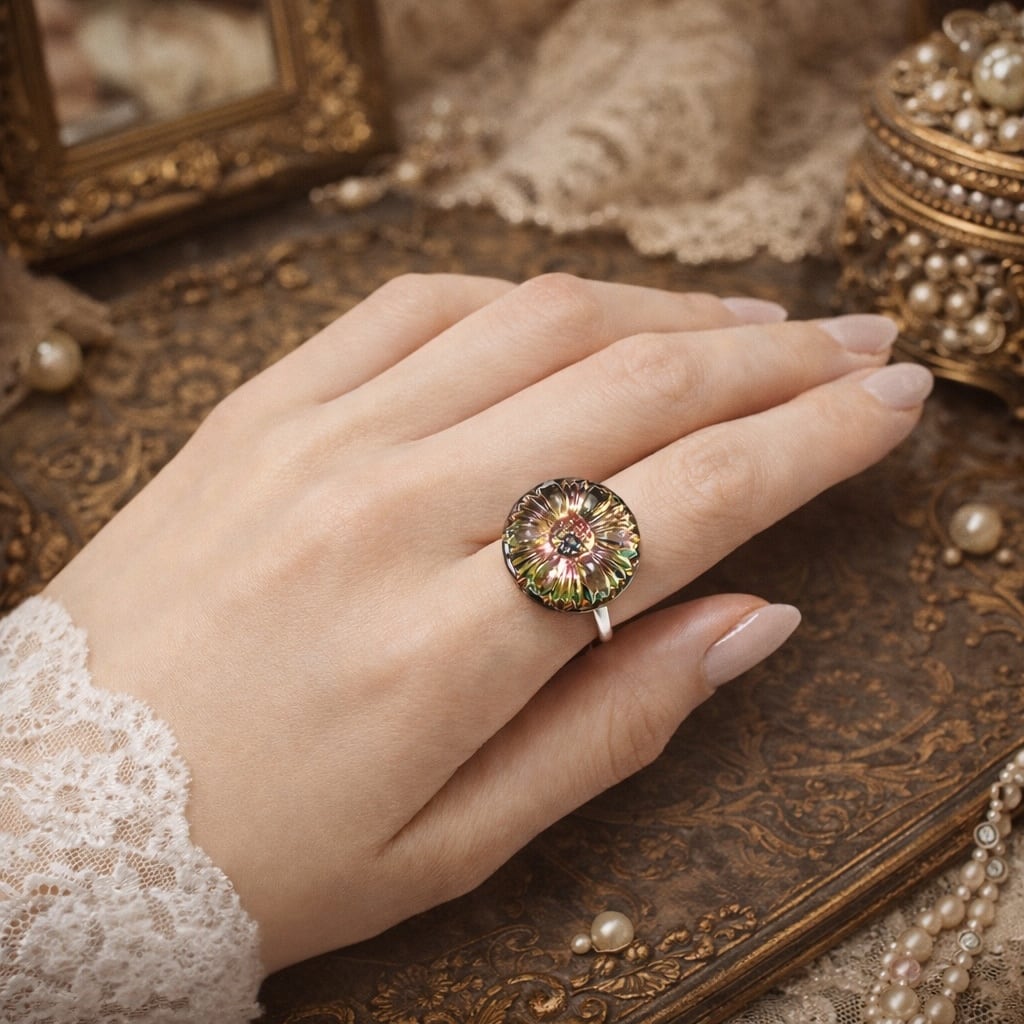 光を受けるたび、シルバーを基調に、ピンク・イエロー・グリーンが溶け合うようにきらめく不思議な表情を持つチェコガラスの指輪です。 花が宵の光に照らされ、静かに色を変えていくように。 角度や光の加減によって、ひとつとして同じ表情を見せないチェコガラスならではの奥行きある輝きをお楽しみいただけます。