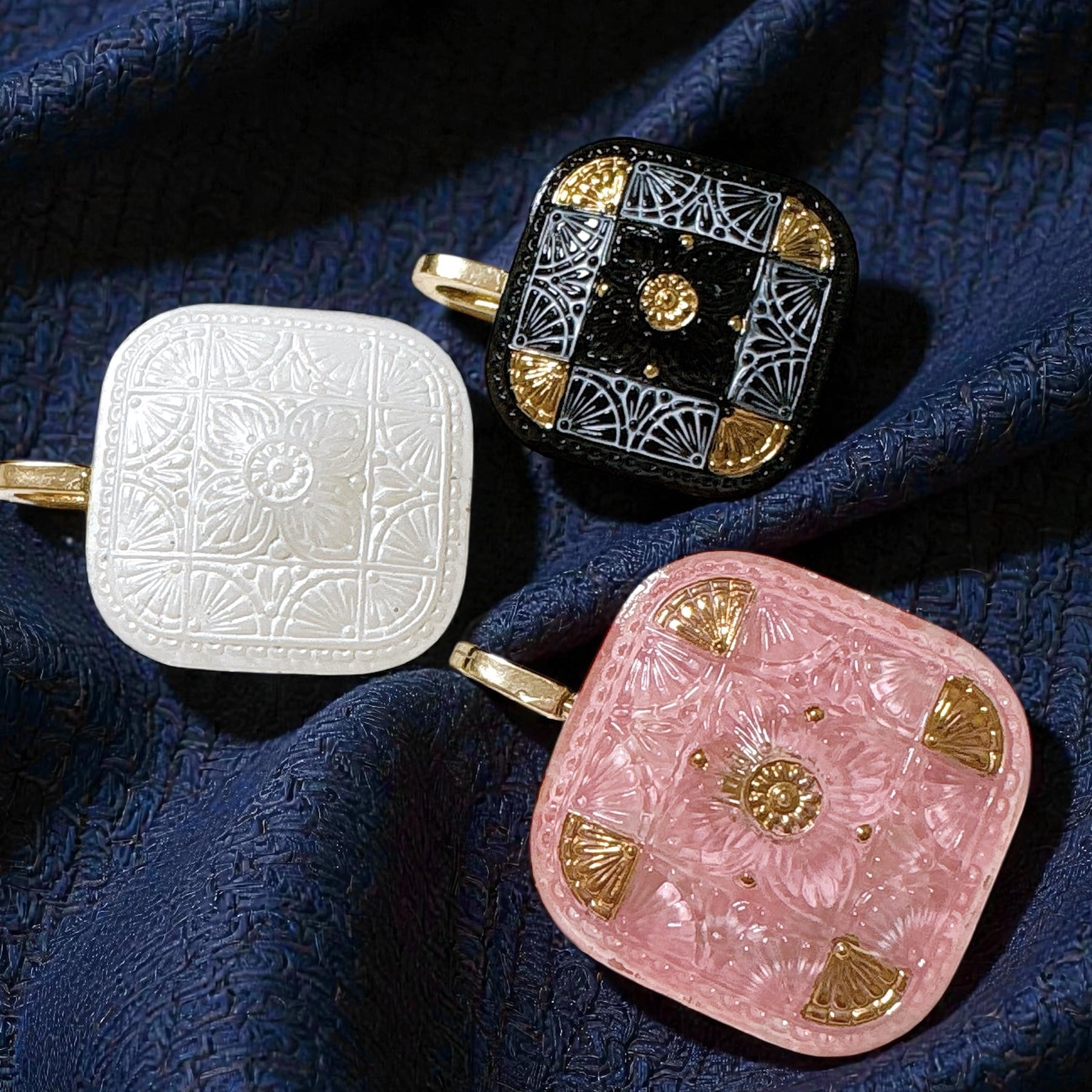 繊細な彫刻模様に、ほのかに光を含んだピンクと金色の装飾が静かに重なり合い、装いにそっと温もりを添えます。
