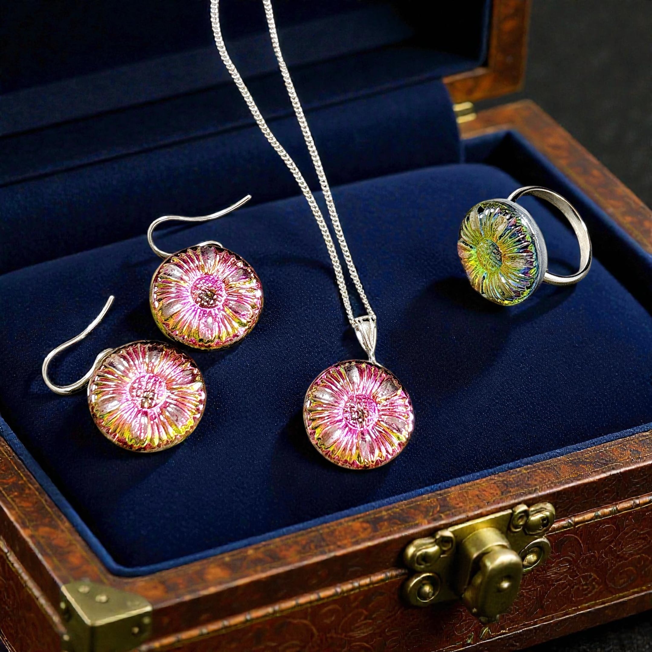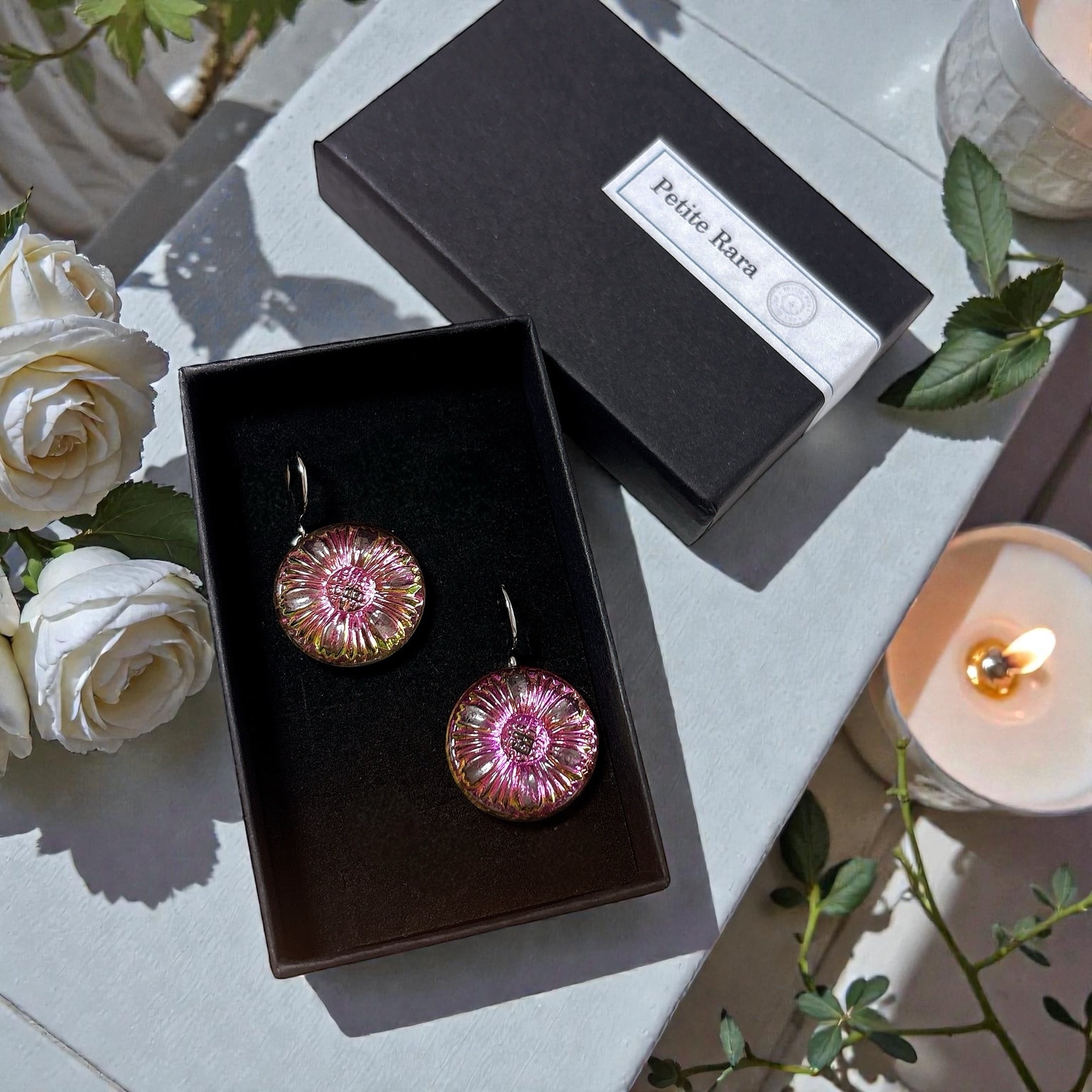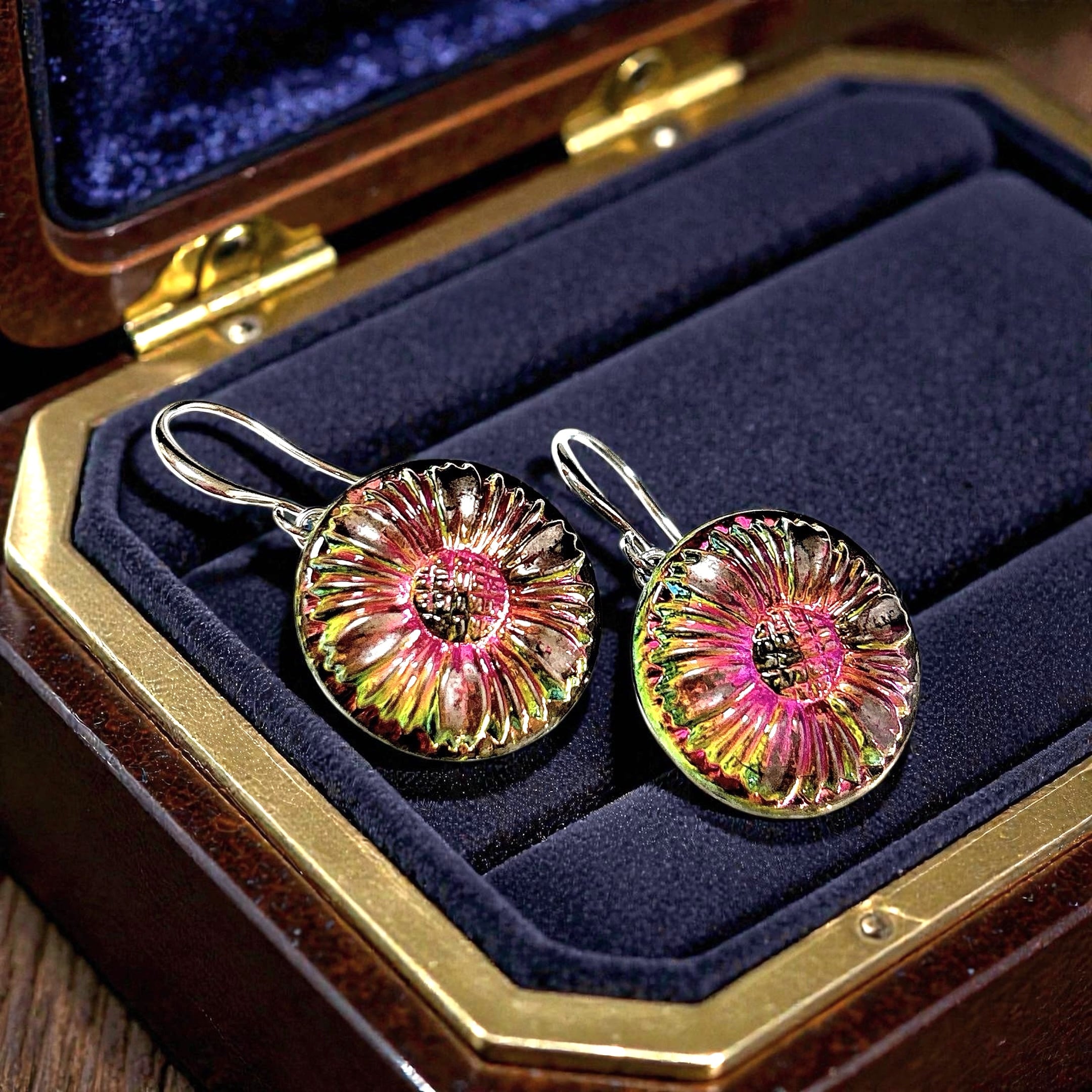 光を受けるたび、シルバーを基調に、ピンク・イエロー・グリーンが溶け合うようにきらめく不思議な表情を持つチェコガラスのフックピアスです。