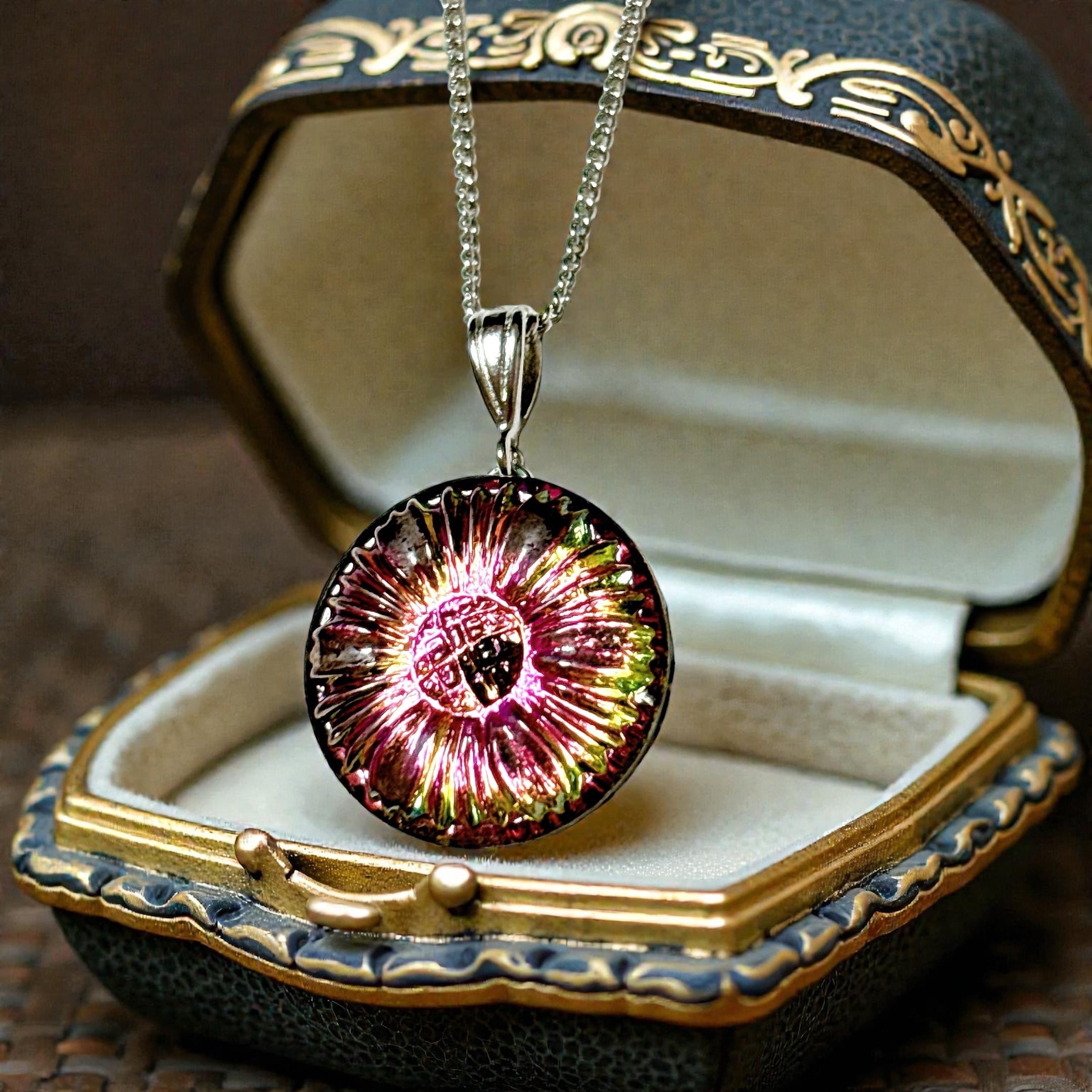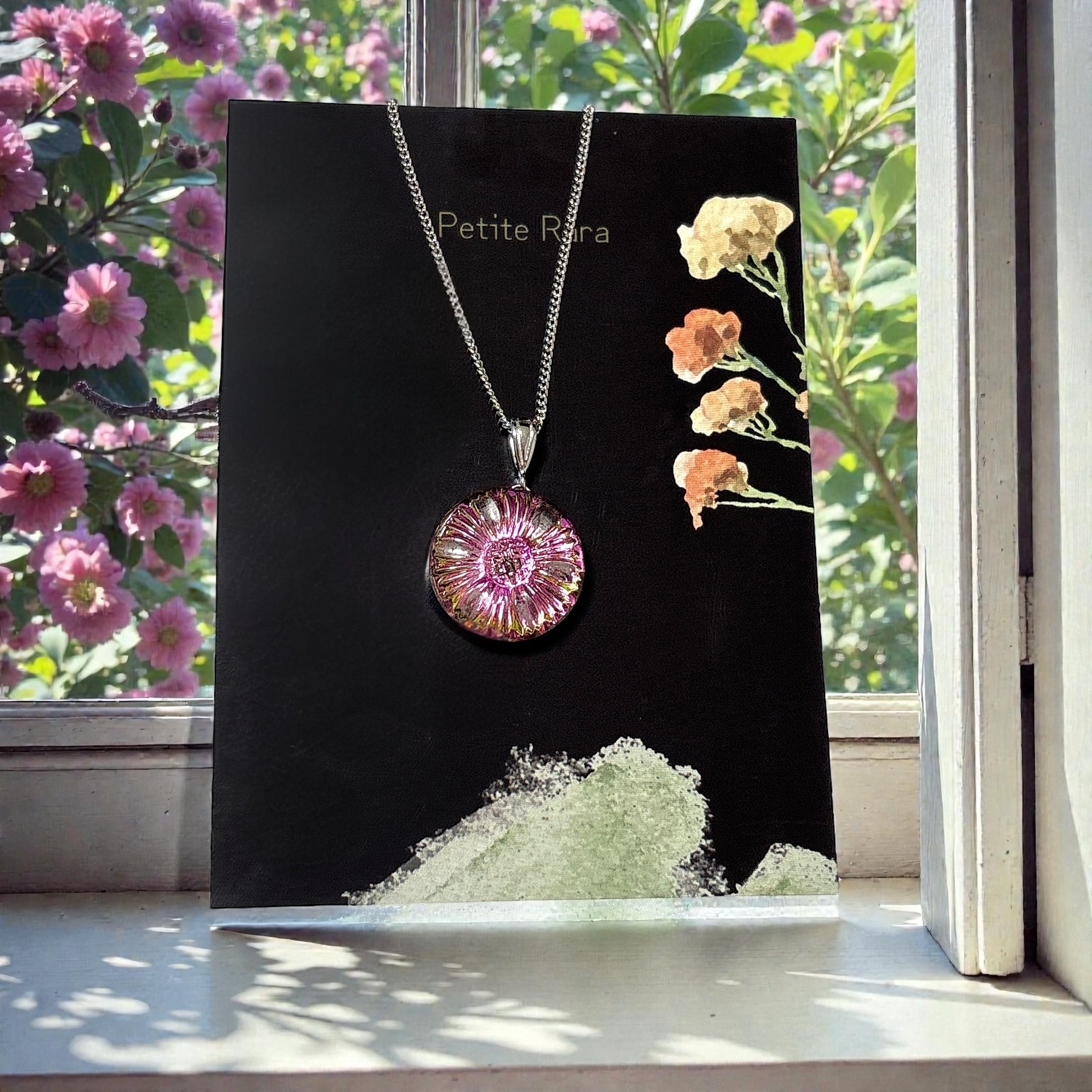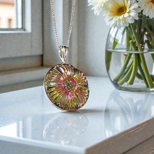 光を受けるたび、シルバーを基調に、ピンク・イエロー・グリーンが溶け合うようにきらめく不思議な表情を持つチェコガラスのネックレスです。