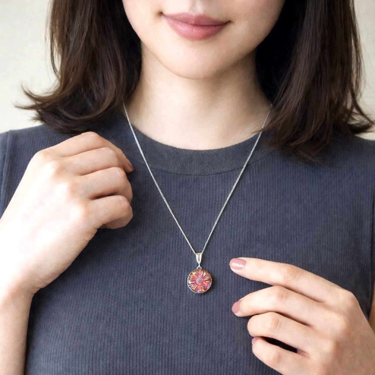 カジュアルからきれいめまで幅広い装いに馴染み、大人の胸元にそっと華を添えてくれます。