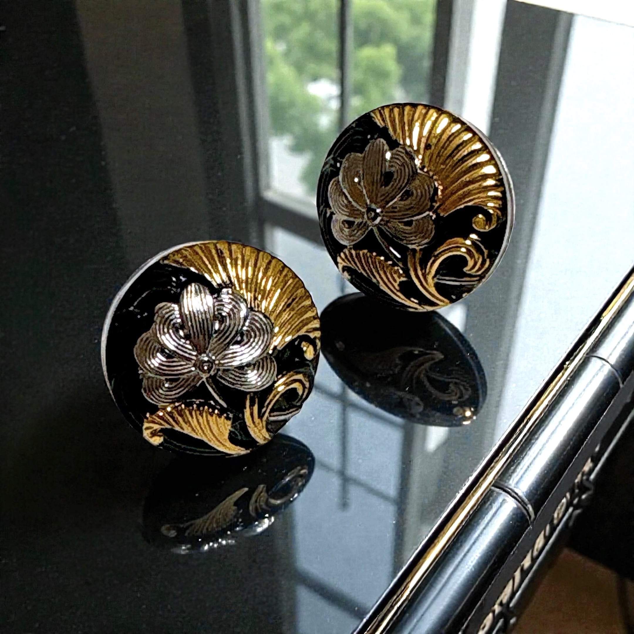 黒地のチェコガラスに、金彩と銀(シルバー)を含む彩りで描かれた花の文様。