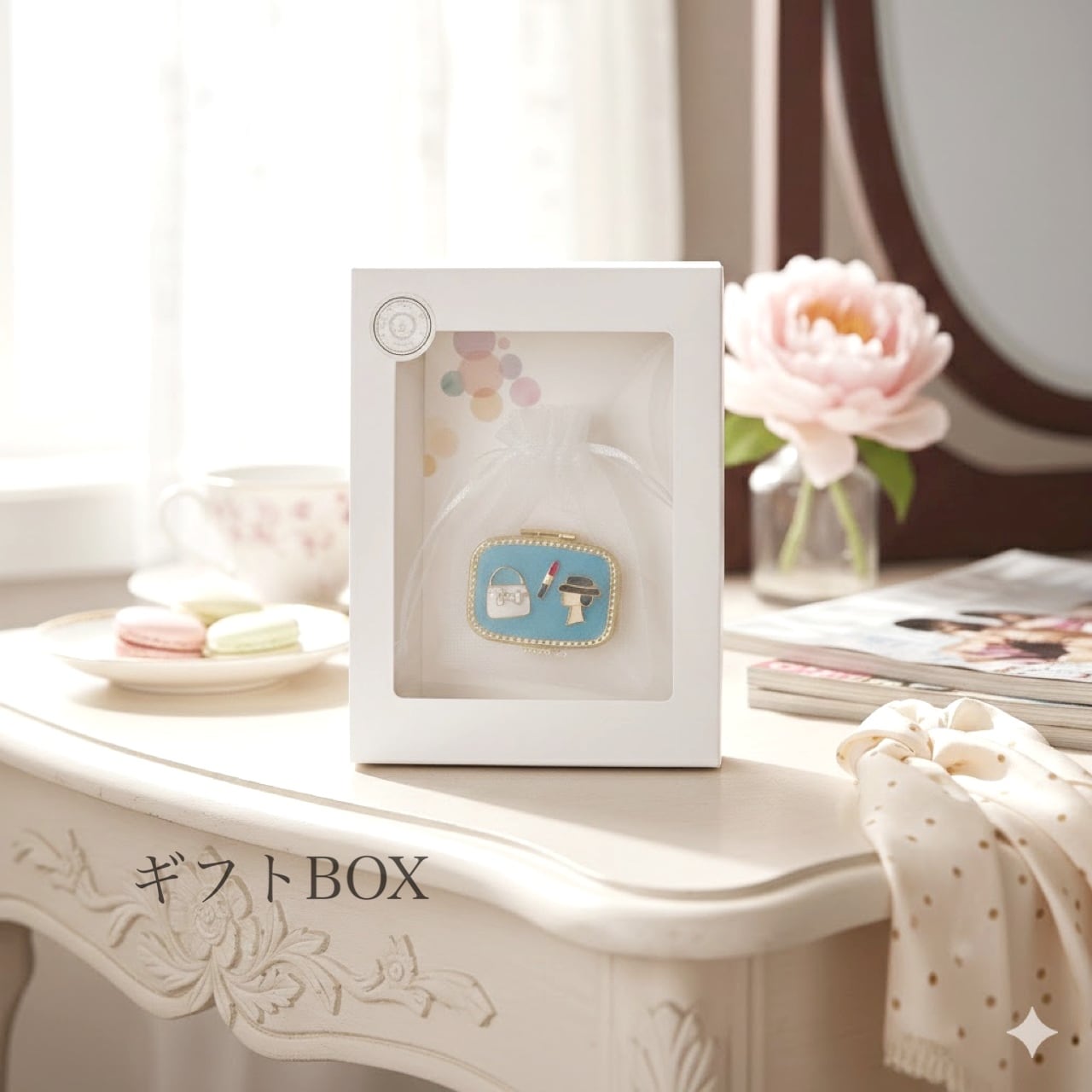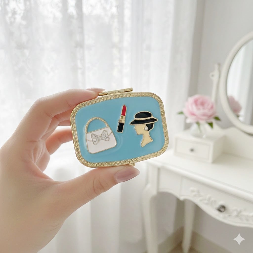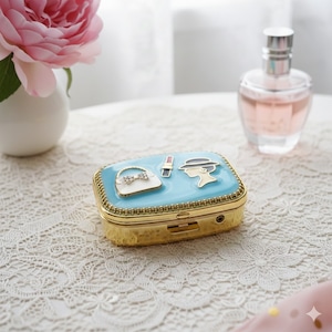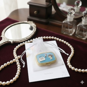 レディモチーフとバッグ、リップの装飾をあしらった、プリンセスのコンパクトのような雰囲気をもつ上品で可憐なジュエリーケースです。