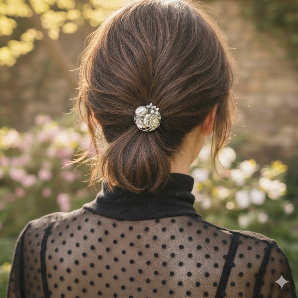 落ち着いた色調が、装いに静かな余韻を添え、まとめ髪にさりげない印象を添えてくれます。