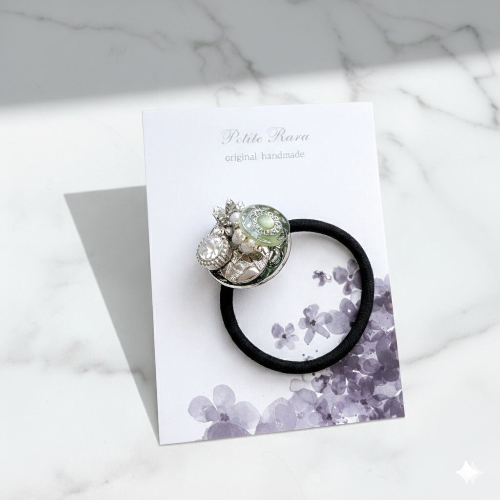 グリーンボタン装飾のヘアゴム(シルバー)No.001| Botonique