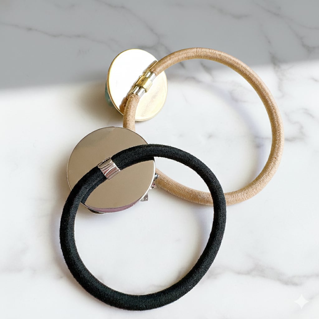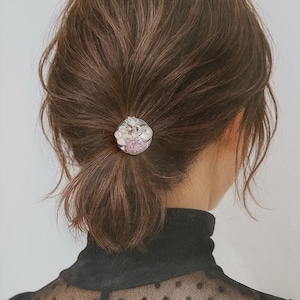 シルバートーンの装飾や異素材を重ねて仕立てBotonique のヘアゴムです。