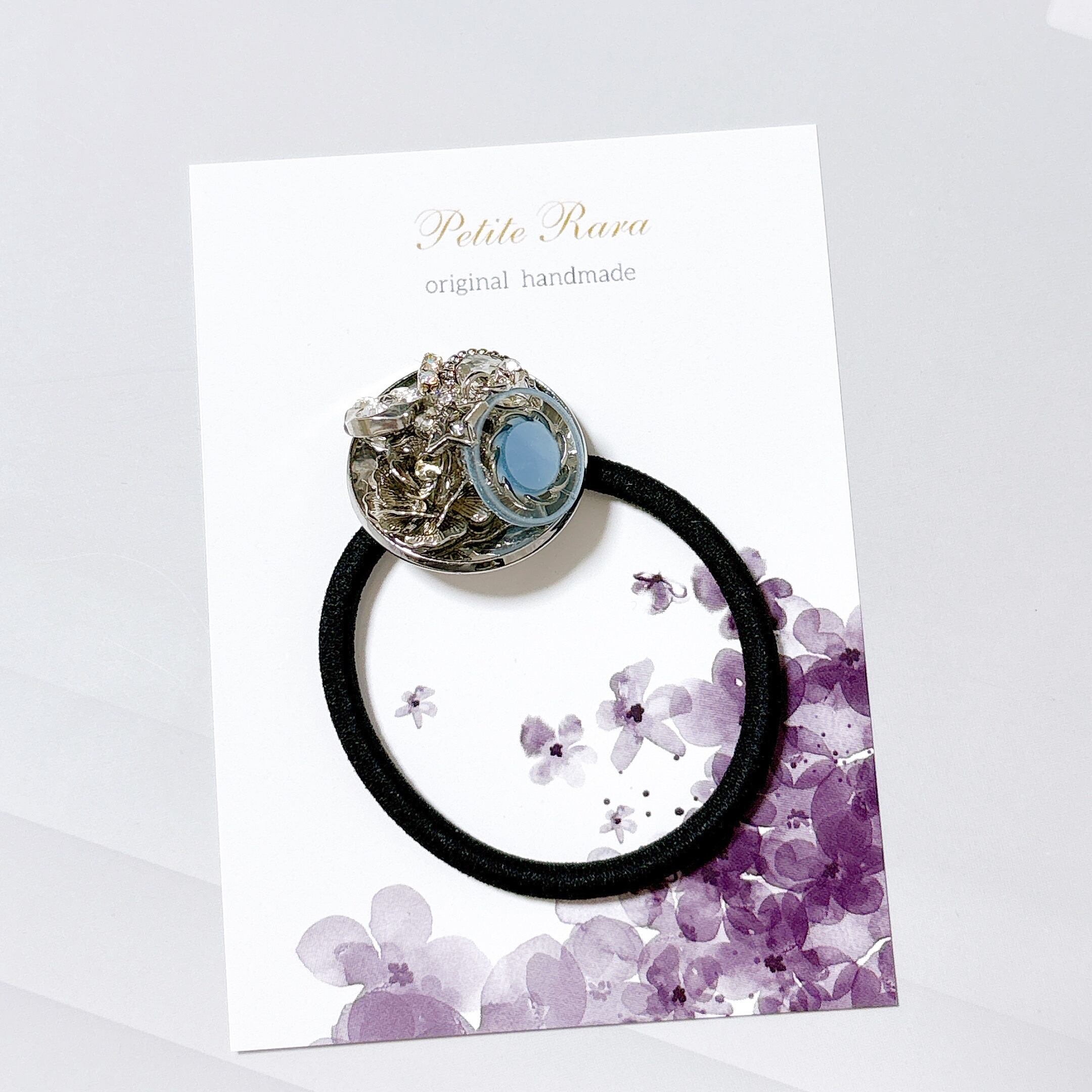 シルバートーンの装飾や異素材を重ねて仕立てBotonique のヘアゴムです。