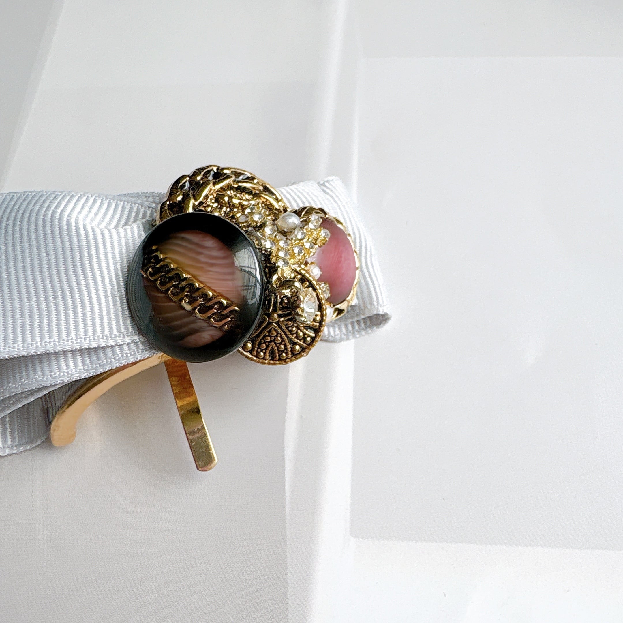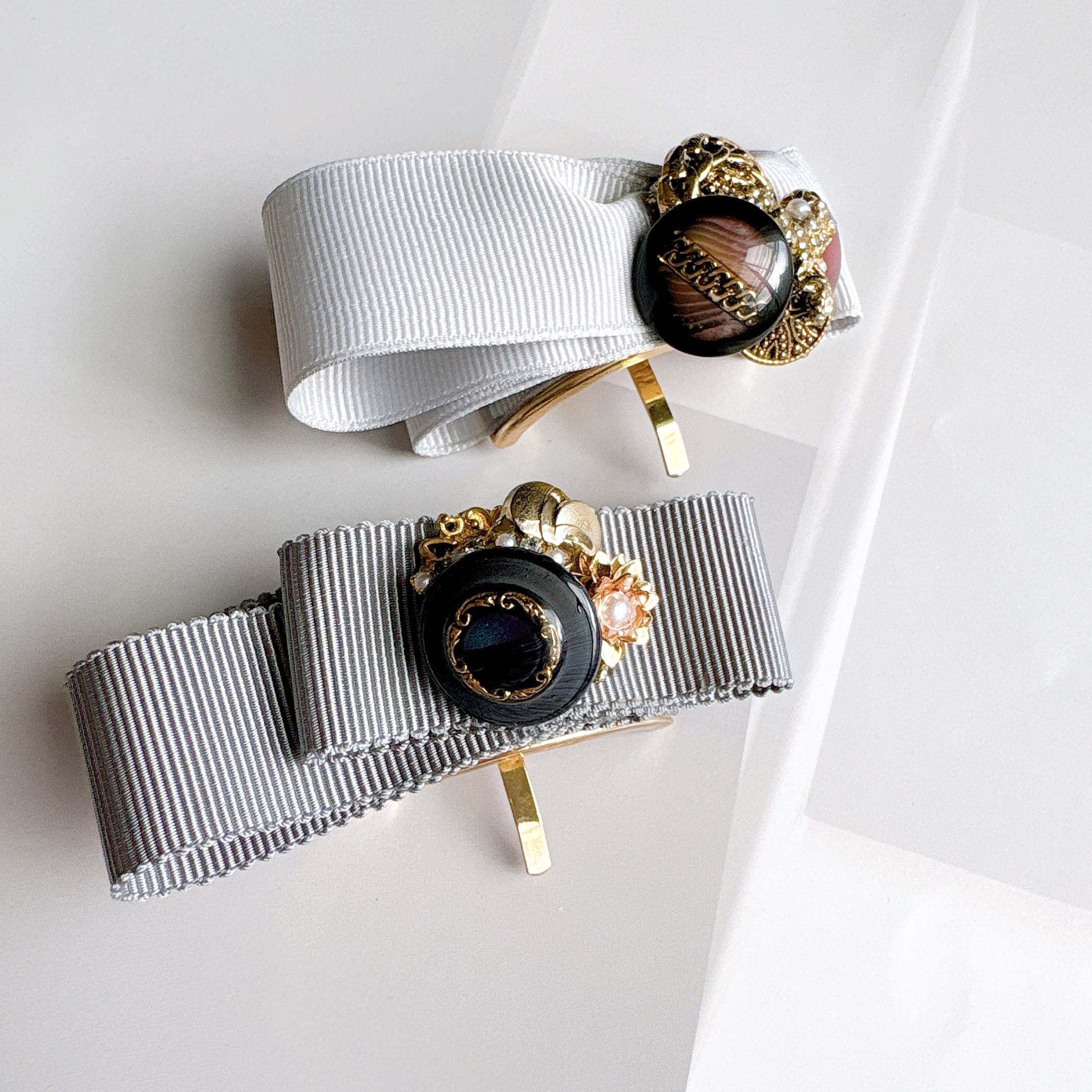 イタリアヴィンテージボタンとリボンのポニーフック(クラシックグレー)No.005 | Botonique