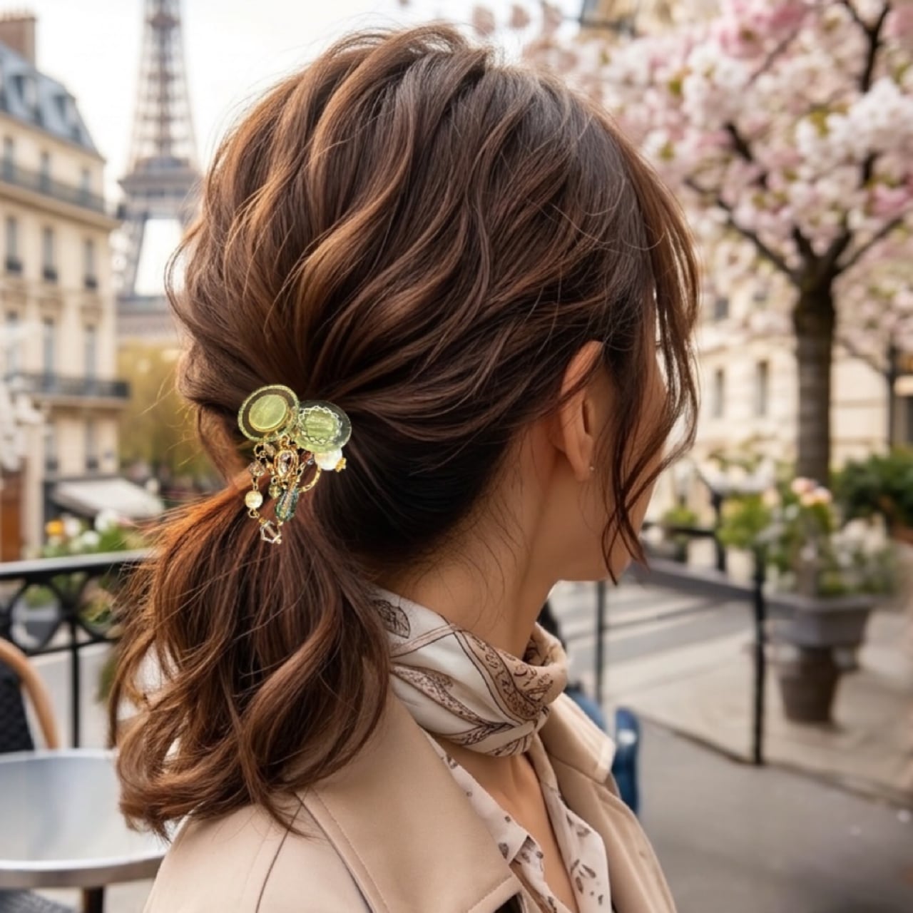 結んだヘアゴムに差し込むだけで装着でき、ポニーテールや一つ結び、まとめ髪にも美しく馴染みます。
