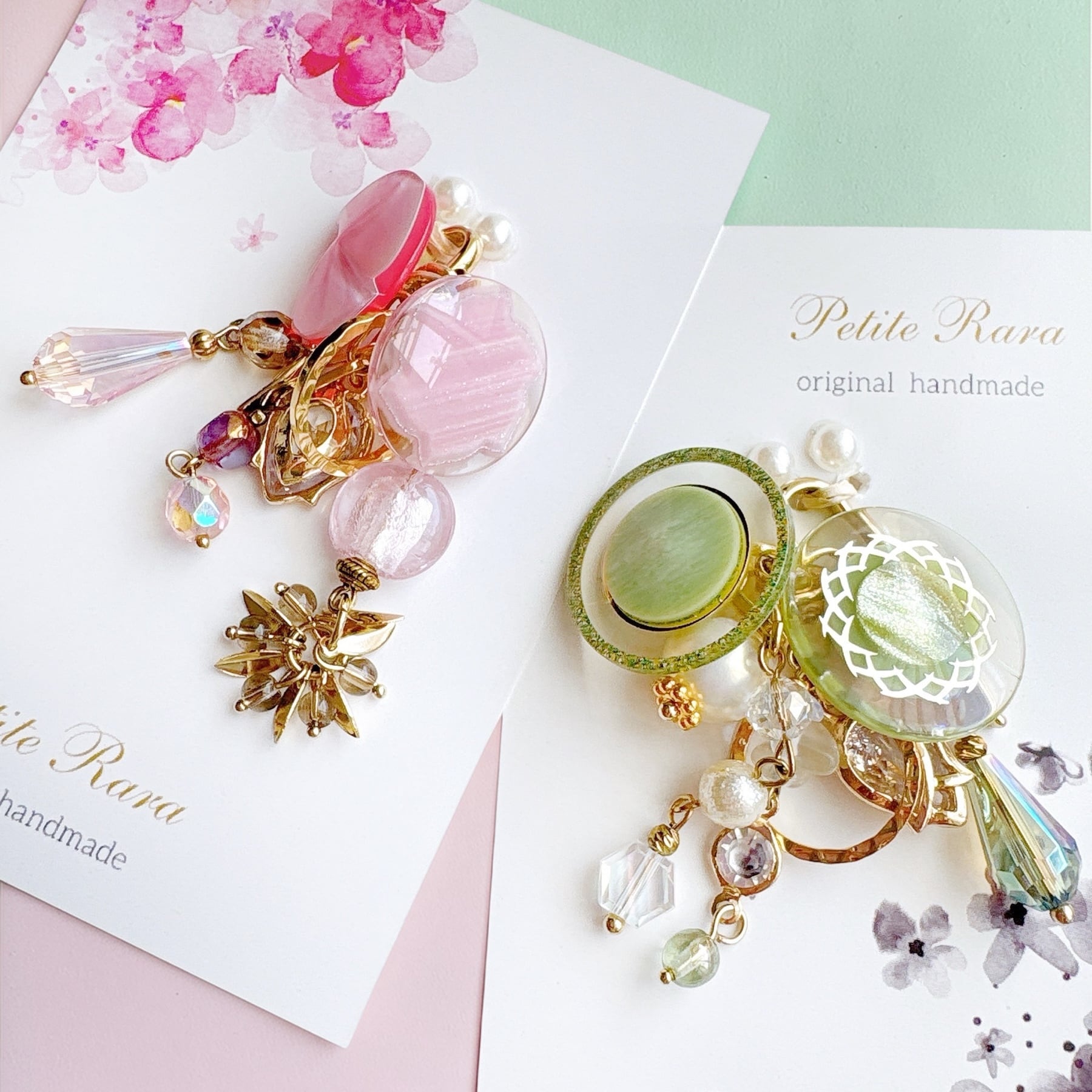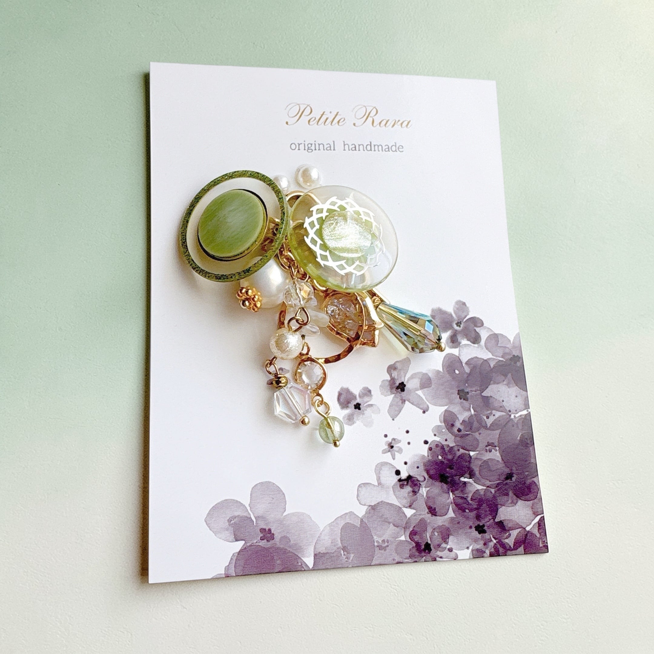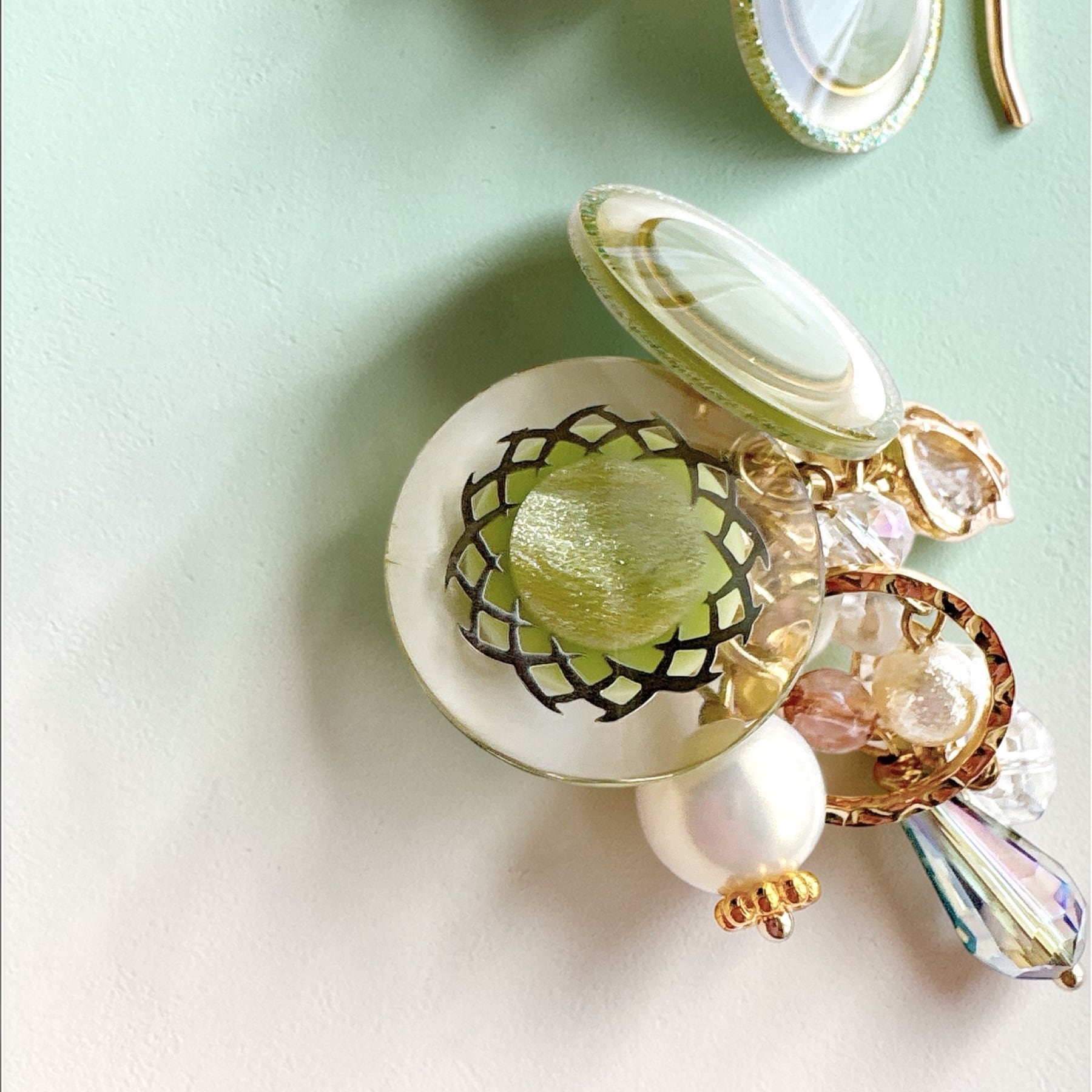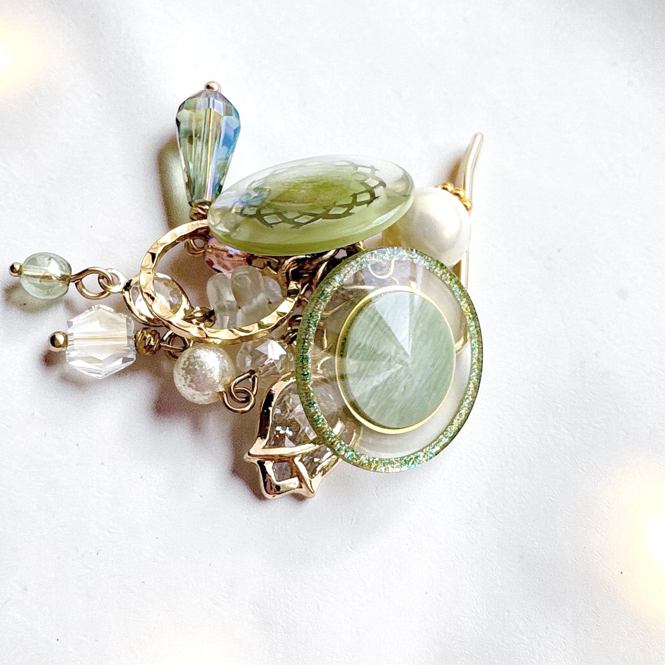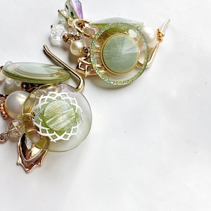 透明感のあるグリーンのガラスやパーツに、天然石をさりげなく添え、光を受けるたびに、静かにきらめく奥行きのある表情を見せてくれます。