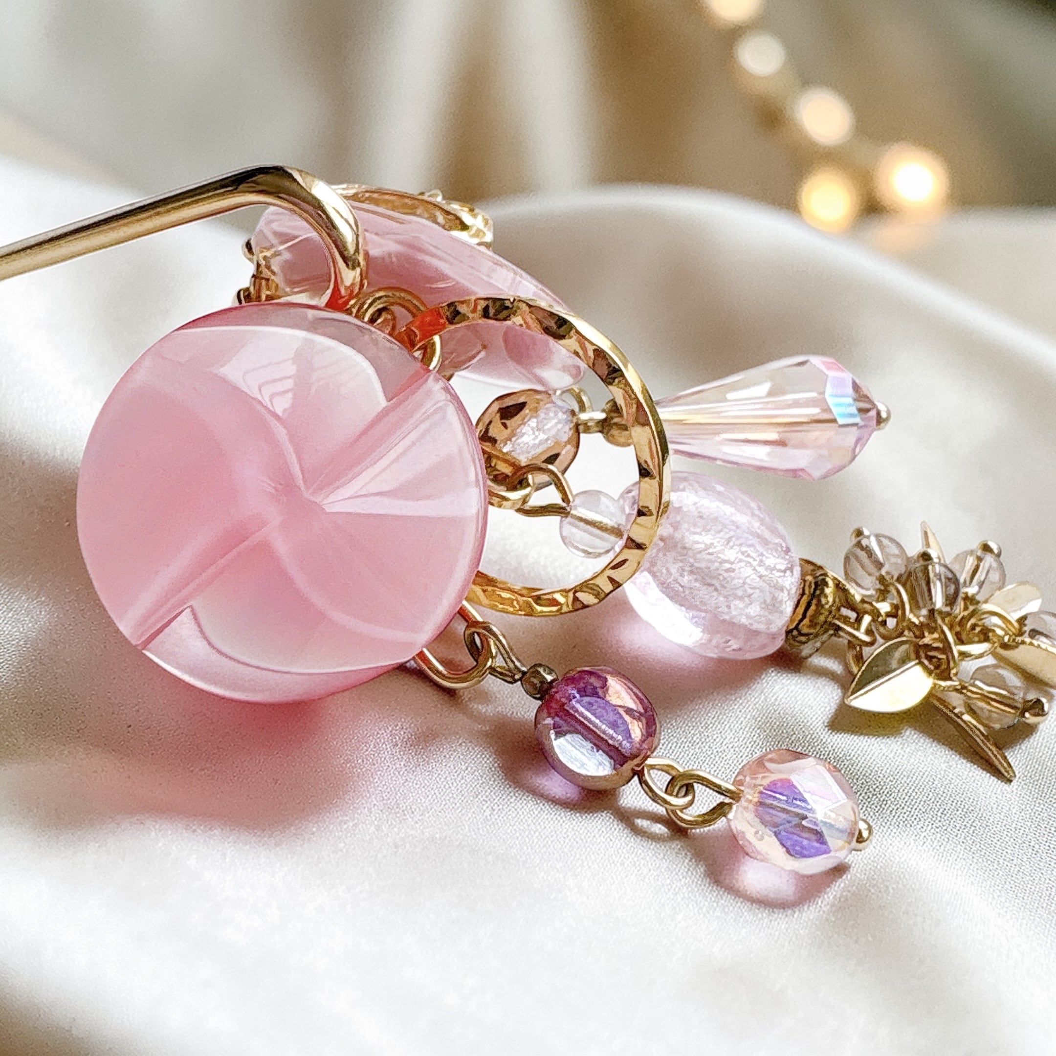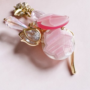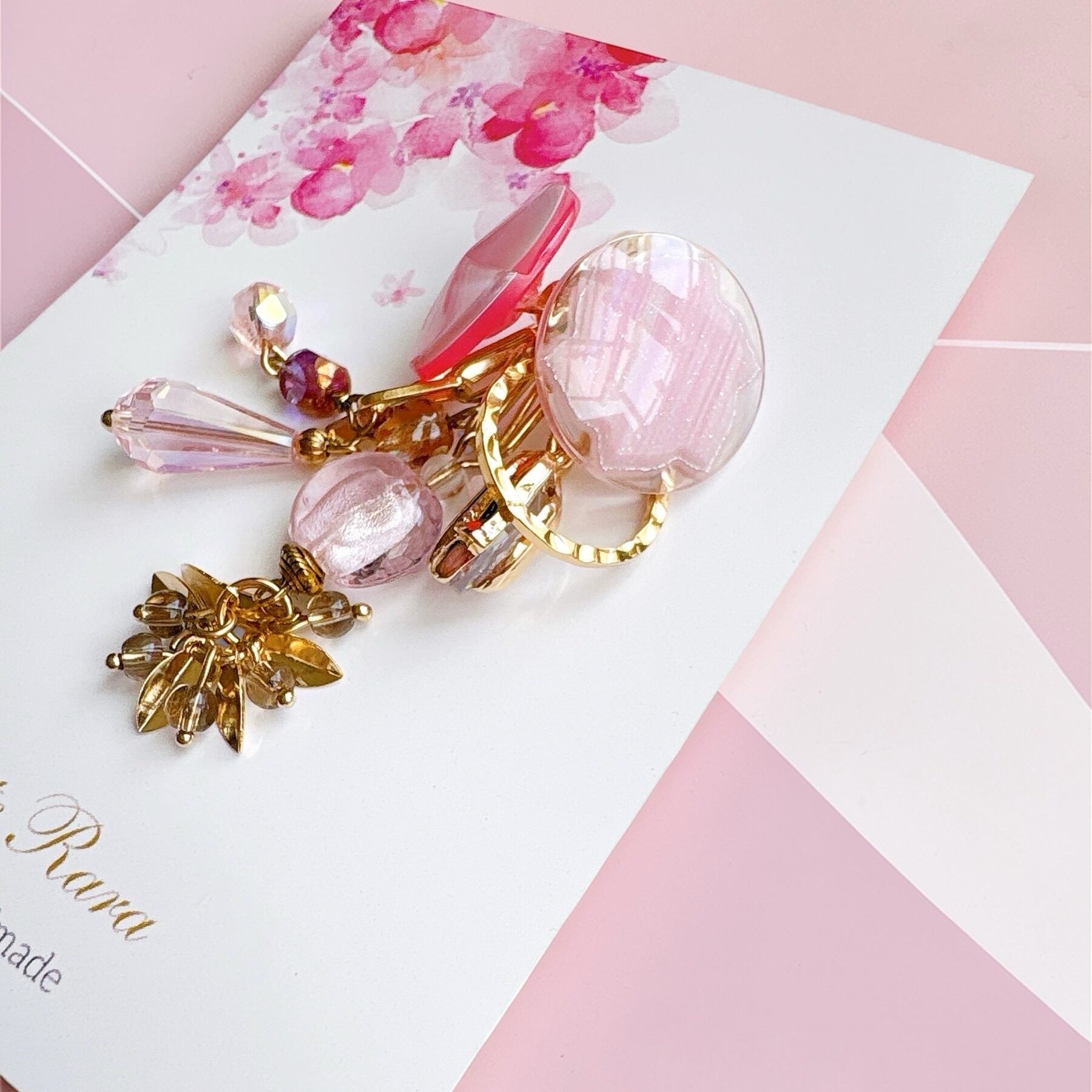 淡いピンクのガラスやパーツが重なり合い、光を受けるたびに、やさしくきらめく表情を見せてくれます。
