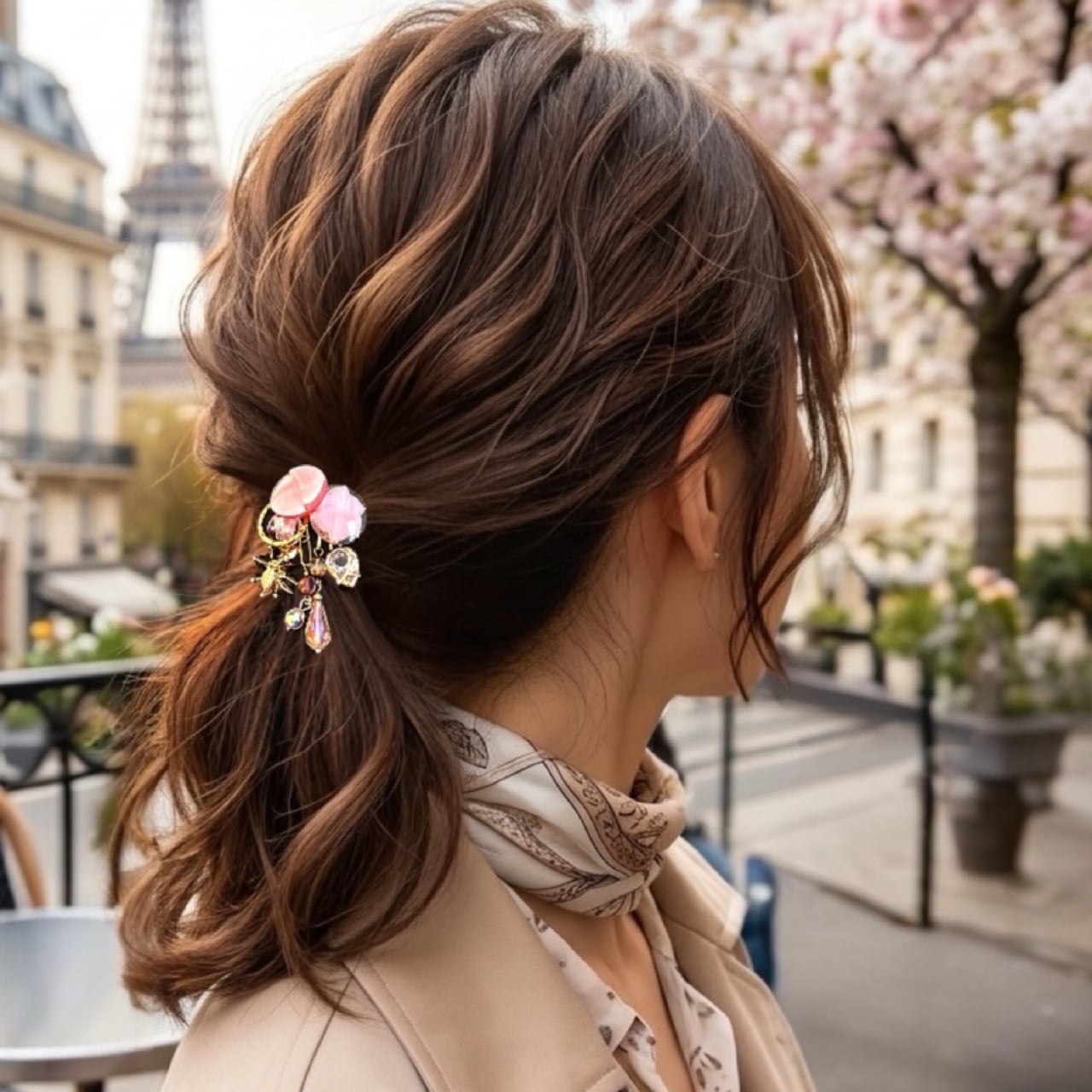 結んだヘアゴムに差し込むだけで装着でき、ポニーテールや一つ結び、まとめ髪にも美しく馴染みます。