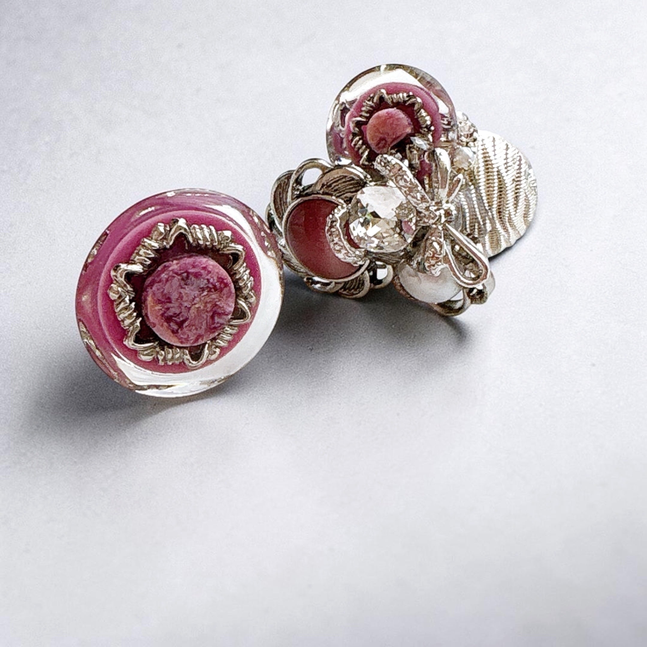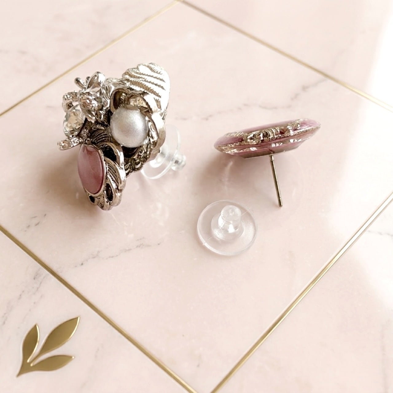 ローズピンク ヴィンテージボタンのピアス(シルバー)No.011
